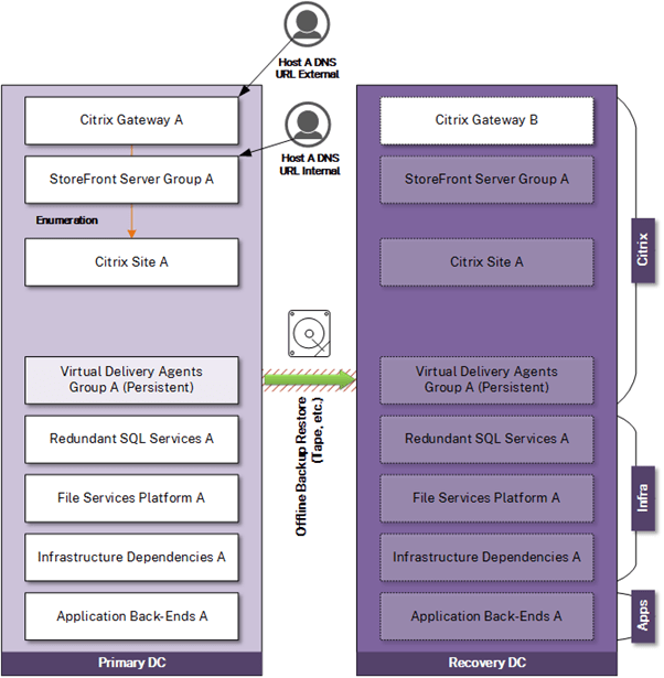 In this option, organizations rely solely on traditional backup solutions to restore the Citrix platform to service in another location. There is no standby infrastructure to fail over to. Multiple, often manual tasks are required in the recovery plan to restore the core services Citrix depends on and later restore Citrix itself. The outage time of Citrix is dictated by the speed at which components can be restored in the DR location. This model is not ideal for advanced Citrix deployments and is best suited for smaller, simpler infrastructures and organizations that can withstand an extended period of downtime.