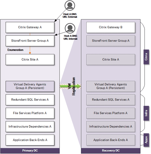 At the time of failover, administrators update the DNS entry for one or more access URLs to point to one or more DR IPs for Citrix Gateway and StoreFront, or users are advised by formal communication to begin using a “backup” or “DR” URL.