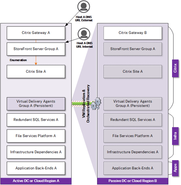 In this option, automated recovery is introduced for several components of the solution to restore the Citrix infrastructure and its dependencies in the DR location. Technologies that orchestrate automated recovery further reduce manual steps and minimize human intervention (and potential human error), and can further improve RTO by streamlining the recovery of service. It is expected that intervention is still required to fail over to the DR location by way of DNS record modifications. It is worth noting that replication is not a replacement for backup. Corrupt or compromised data still gets replicated to DR and is thus not useful in such scenarios. Backups are still be considered as a fallback. While this model is more mature, it remains unsuitable for use with advanced Citrix configurations or for organizations that can’t tolerate much downtime.