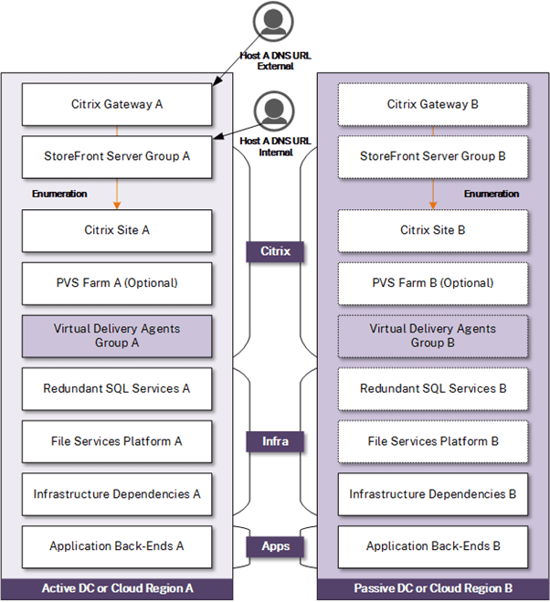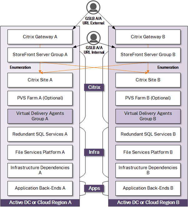 A more advanced but common configuration with enterprise organizations that allows access tier URLs to operate in an Active-Active manner via NetScaler GSLB (NetScaler Advanced or higher needed). This functionality is useful in environments with local data center proximity to each other, or in situations where data centers can be remote but with the means to pin users to preferred data centers (often driven by advanced StoreFront configurations and GSLB to a lesser extent) for multi-site scenarios.