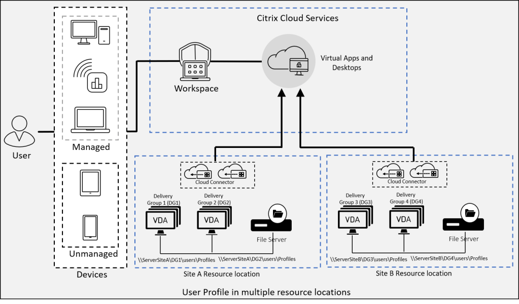 The preceding diagram show multiple datacentre locations (Site A and Site B) users are connecting to Citrix in particular Site A resource location will retrieve their roaming profiles from a file server in the Site A datacentre. Similarly, a user connecting to Citrix in a particular site B resource location will retrieve their roaming profiles from a file server in Site B data center.