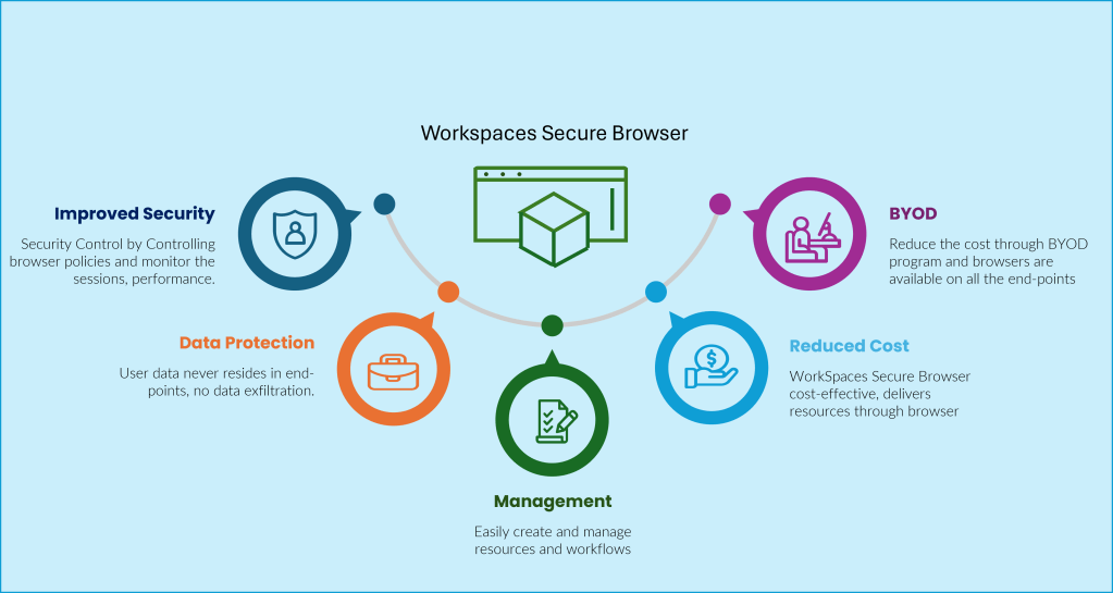 To provide a protected environment to end-users to access private websites, software-as-a service applications, internet, organization internal applications with the required security controls, AWS has solution called “WorkSpaces Secure Browser” previously this product was known as Amazon Secure web. Amazon WorkSpaces Secure Browser is a fully managed, cloud-native, hosted browser service used to deliver resources to end-user security over the browser. WorkSpaces secure Browser works with a user’s existing web browsers and IT within the organization need not manage any appliances, infrastructure, specialized client software or any virtual private network connections.